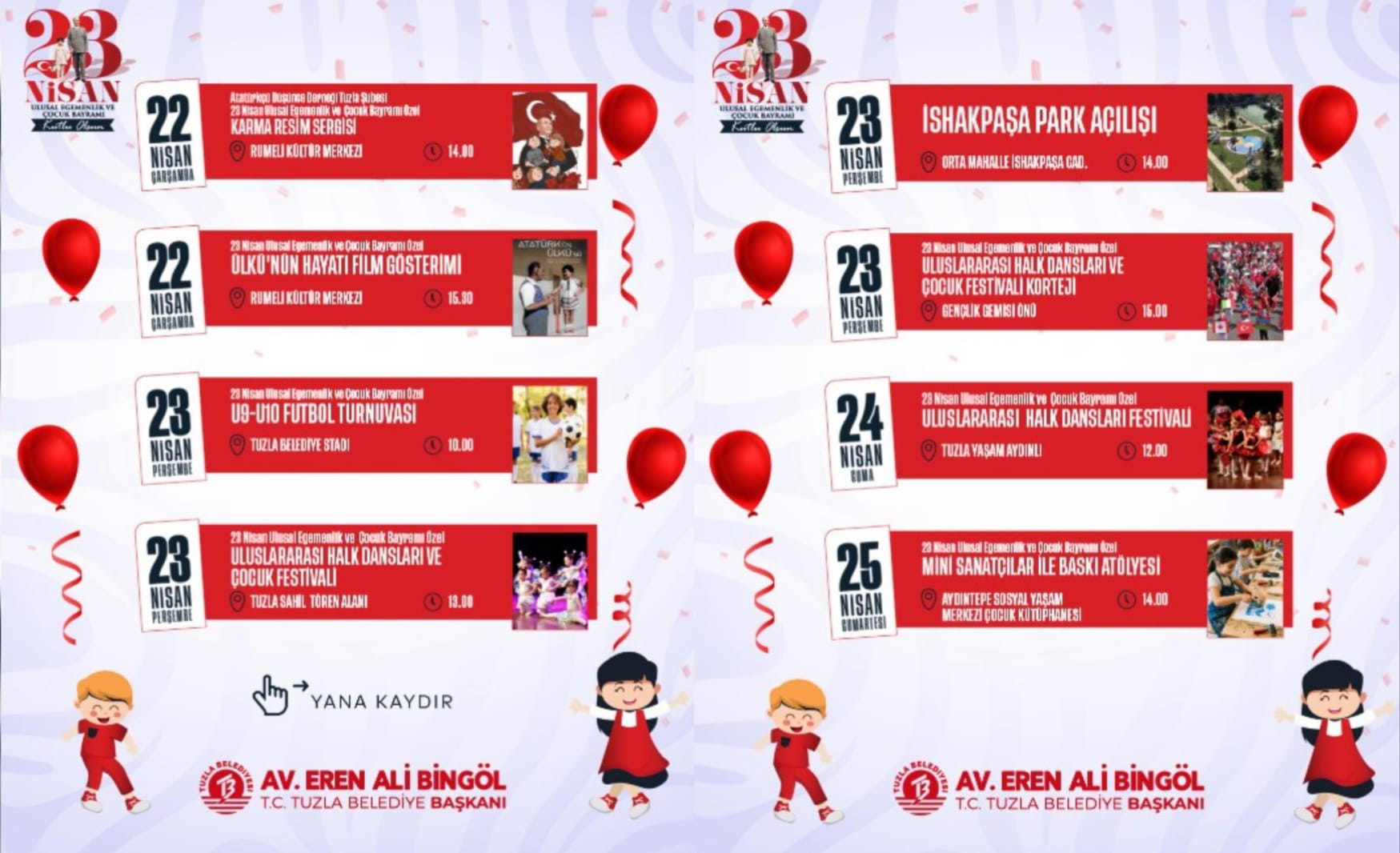 23 Nisan günü Tuzla Belediyesi Stadı’nda düzenlenecek U9-U10 Futbol Turnuvası ile başlayacak etkinlikler, Tuzla Sahil Tören Alanı’nda gerçekleştirilecek Uluslararası Halk Dansları ve Çocuk Festivali ile devam edecek. Günün ilerleyen saatlerinde park açılışı ve kortej programı ile kutlamalar zirveye ulaşacak.